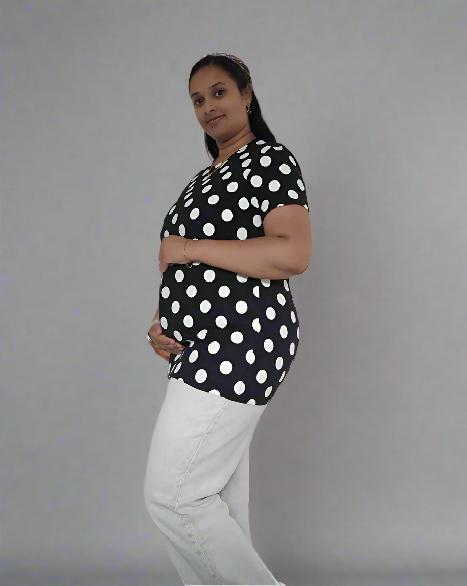 Crafted from soft knitted cotton, this nursing T-shirt features an easy pull-up design for convenient feeding. Its round neckline and 3/4 sleeves provide comfort and style, while the roomy belly area accommodates your changing shape. Available in black and white with a polka-dot pattern, it comes in sizes S through 3XL and offers a standard length without pockets.
